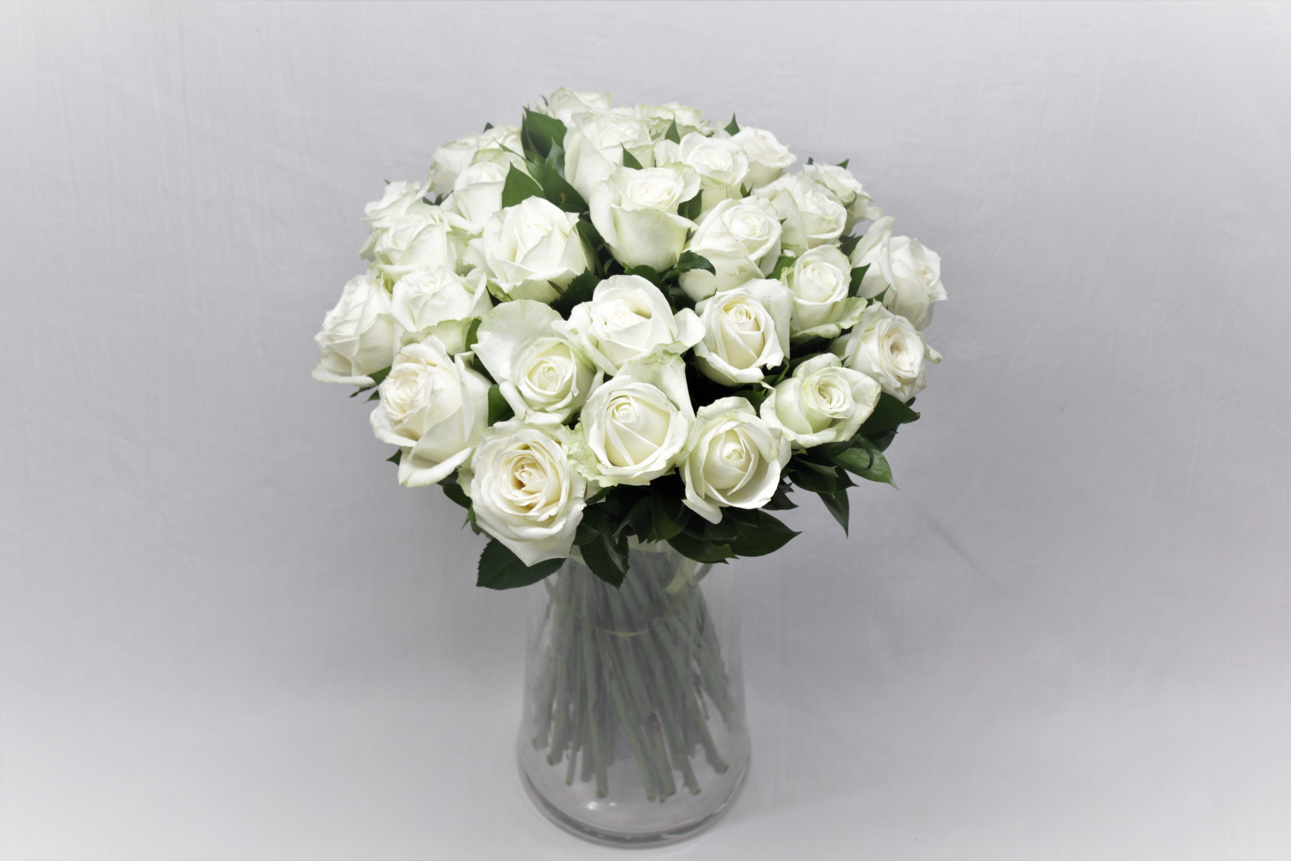 Ce bouquet contient de splendides roses blanches (70 cm) qui procureront une pure sensation de fraicheur. La variété blanche ‘Avalanche’ a de gros boutons impressionnants. Le blanc est associé à la fidélité et à un grand respect.